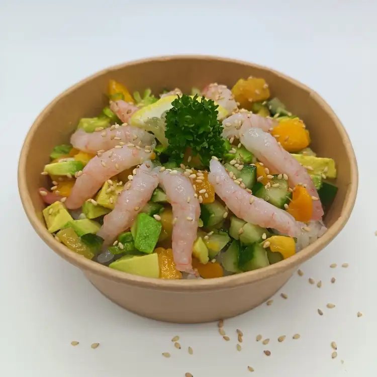 Salade de crevettes nordiques crues, avocat, mangue, concombre, cébette, sésame, riz vinaigré, jus de citron, sauce soja
