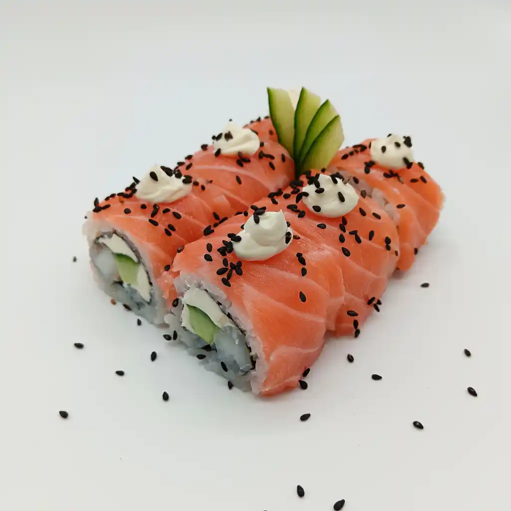 Saumon, crevette, concombre, fromage frais, algue nori, riz vinaigré et graines de sésame, 6 pièces